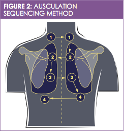 For the purposes of the exam, the anterior, posterior, and mid-axillary regions can be divided into 4 horizontal sections, and the anterior and posterior regions can be further divided into 2 lateral sections (right and left). There are a total of 8 assessment sites on each of the anterior and posterior regions and 4 on each of the mid-axillary regions. For the anterior and posterior exam, the patient’s lungs should be assessed from top to bottom, going left to right in a zigzag manner (see Figure 2). For the mid-axillary assessment, going from top to bottom at each of the 4 sites is recommended. The goal of auscultation is to listen to 1 complete respiratory cycle at each of the sites while paying particular attention to the duration, pitch, and intensity of the breath sounds and comparing them symmetrically.