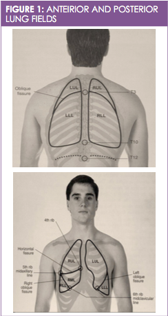 A quiet room and a stethoscope are needed when examining the patient with the intent of auscultating their breath sounds. The diaphragm of the stethoscope should be used for the assessment, and the exam should focus on listening to the anterior, posterior, and mid-axillary regions of the lungs (see Figure 1). The exam should not be conducted over clothing of any kind, regardless of how thin that clothing may be; it should be done in such a manner that the stethoscope has direct contact with the skin.