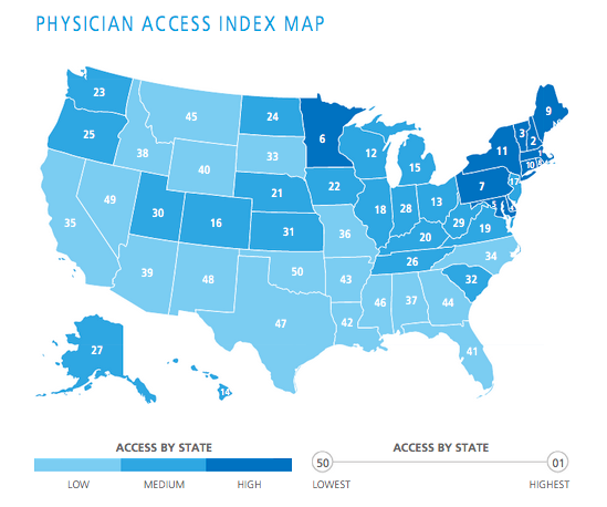 According to the firm’sPhysician Access Index, Massachusetts, New Hampshire, Vermont, Delaware, and Maryland have the most positive physician access variables, while Mississippi, Texas, New Mexico, Nevada, and Oklahoma have the fewest.