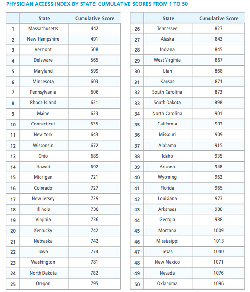 “When it comes to accessing physicians, not all places or all patients are equal,” stated Mark Smith, president of physician search firm Merritt Hawkins that published these state rankings. “As the health care system evolves, there will be clear access ‘haves’ and access ‘have-nots,’ and the rankings reflects these imbalances.”