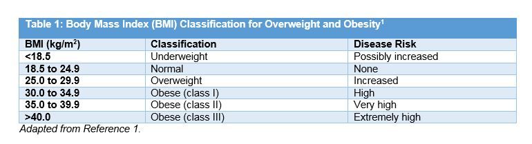 Body mass index (BMI) (kg/m2) is the standardized measure used to define obesity (Table 1).1In the United States, 1 in 3 adults is obese (BMI ≥30 kg/m2) and another 1 in 3 adults is overweight (BMI ≥25 but <30 kg/m2).2