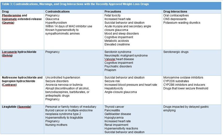 Lorcaserin is a selective 5-HT2C agonist thought to promote weight loss via appetite suppression.18The drug is dosed at 10 mg twice daily with no need for dose titration. If a weight loss of at least 5% compared with baseline is not achieved after 12 weeks of treatment with the twice daily 10-mg dose, the drug should be discontinued. Lorcaserin has an uncomplicated dosing regimen (one dose for all patients) with no dosage adjustments recommended in any subgroup of patients. In patients with mild renal impairment, no dose adjustment is required. For patients with moderate renal dysfunction, caution with the use of lorcaserin is recommended. For patients with severe renal impairment or end-stage renal disease, lorcaserin is not recommended. No dosage adjustment is required for patients with mild-to-moderate hepatic dysfunction, but the drug is not recommended in patients with severe hepatic impairment. The most common AEs that occur with lorcaserin include headache, nausea, vomiting, dizziness, fatigue, dry mouth, and constipation.18Contraindications and warnings are summarized in Table 3.17-19,21