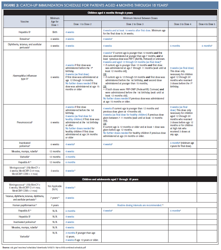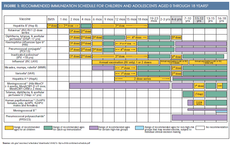 Parent and patient education is often the key to increase immunization rates. Clinicians should become familiar with the ACIP recommended vaccine schedules and be prepared to address questions and fears some parents may have regarding the use of vaccines. Keep an open mind when responding to parents’ or caregivers’ questions about immunizations. Being prepared to discuss these concerns calmly and provide evidence-based information will ensure improved immunization rates in your practice. Timely immunization of children in the United States with today’s vaccines is essential to maintaining our nation’s public health.