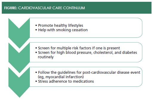 Expanding from episodic treatment to chronic CVD management as a national service strategy for your chain or a local initiative to engage underserved populations requires a specific skill set. Cardiovascular care occurs on a continuum (seeFigure). It begins with screening for the basic indicators. Collecting and documenting the following information from the patient is critical: sex, age, blood pressure, cholesterol, blood sugar, smoking, level of physical activity, and cardiovascular risk. Counseling about lifestyle often helps patients make small changes that have profound impact on cardiovascular health. Nurse practitioners and physicians’ assistants have proven they are effective in this role.6,7