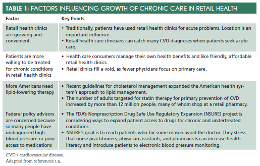 Multiple factors make provision of cardiovascular disease treatment in retail health clinics a helpful treatment option for all but the most critical patients.