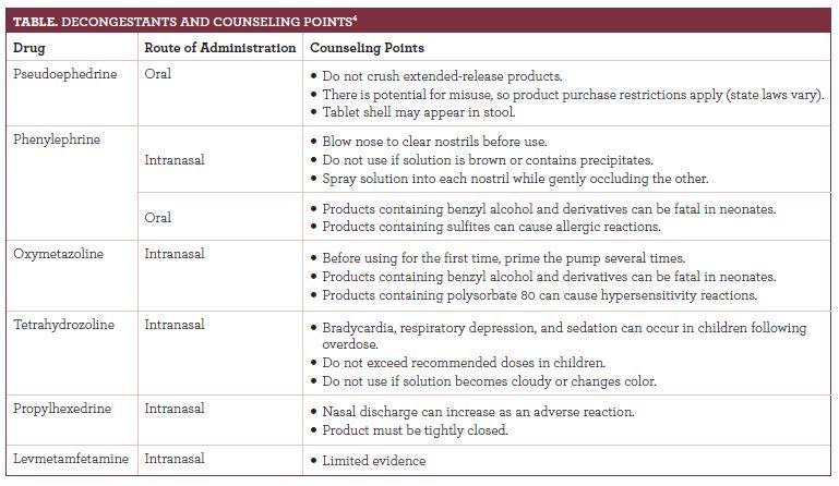 Practitioners must recognize the risks of prescribing and recommending all medications. Effective patient education is important to prevent adverse events (AEs). TheTablesuggests drug-specific counseling points to raise with patients when recommending a decongestant.4