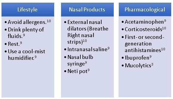 Clinicians can recommend the lifestyle modifications and nasal products listed in theFigurefor most patients.10Consider the primary symptoms and the underlying etiology of the patient’s condition when selecting pharmacotherapy alternatives or additions to decongestants.5