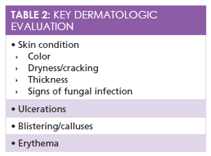 A thorough physical examination should always begin with a visual inspection of the patient in a well-lit, private room. The patient should remove socks and shoes prior to the examination. Ill-fitting footwear can cause deformities and are a common cause of foot ulceration development. Inappropriate footwear can include shoes that are an incorrect size inclusive of width, length, height, and the toe-box size. Patients whose shoes are excessively worn should be encouraged to obtain newer, well-fitting footwear because excessively worn shoes do not provide enough support for the diabetic foot. Evaluating the dermatologic state of the skin is imperative;Table 2highlights key features. A visual evaluation of the musculoskeletal foot frame should ensure there are no deformities or muscle wasting.1Patients should be taught how to inspect their foot daily, and if they find any concerning sores, ulcerations, or damaged areas, they should be evaluated by their medical provider.