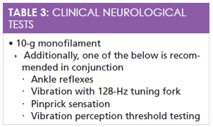 One of the leading precipitating factors in the most frequent triad of foot ulceration causes is peripheral neuropathy. According to the American Diabetes Association (ADA), the detection of loss of protective sensation (LOPS) is now the most recommended method for clinical examination versus evaluating for early neuropathy.1The LOPS examination consists of a combination of 5 different tests, is uncomplicated, and there is no costly equipment necessary to be thorough. Although only one of the 5 tests needs to be completed annually, best practice indicates that using a 10-g monofilament and any of the additional tests (Table 3) is more comprehensive. Two normal tests indicate that the patient is not currently suffering from LOPS, whereas one or more abnormal tests indicate the presence of LOPS.
