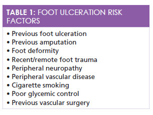Discussing and evaluating a few key elements can assist in preventing foot ulcerations. Taking an in-depth history is an important, necessary component of any patient interview, but it cannot be the sole basis for a diagnosis and risk examination. The past medical history can reveal red flags that the provider can note for the upcoming physical examination. For example, a previous ulceration or amputation places the patient at a higher risk for developing another ulcer. Additional risk factors for foot ulceration are listed inTable 1in no particular order. A discussion of any symptomatology the patient is experiencing is warranted and should include any neuropathic and vascular complications.