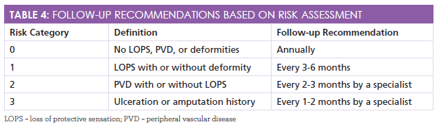 The prevention of diabetic foot ulceration requires assertive and continued teamwork by the provider and the patient.Table 4charts recommendations for follow-up to ensure continued reevaluations and reminding patients that wearing appropriate shoes, inspecting their feet daily, and being active participants in their health care can reduce the incidence of ulcerations.