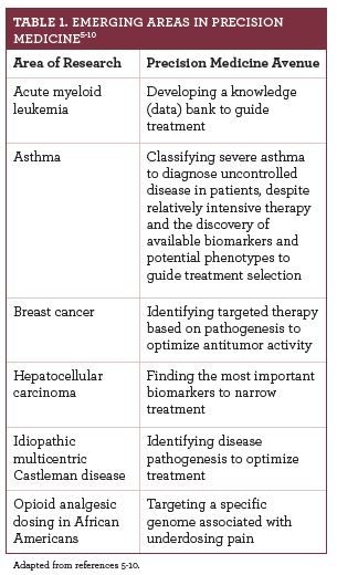 However, the health care system has evolved, and many of these patients can now find their ideal treatments using precision medicine. Precision medicine, a revolutionary way to look at treatment, is an initiative that was promoted extensively during Barack Obama’s presidency.1Instead of a 1-size-fits-all approach, precision medicine considers the patient’s environment, genetic variation, and lifestyle. This is most useful in the oncology setting because of cancer’s numerous genetic variations.2Precision medicine’s goal is to reduce unnecessary “shotgun” approaches to treatment and use the most beneficial medicine for the patient.