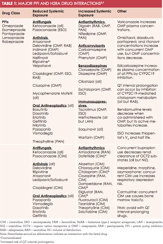 Clinicians must consider past medical history and potential drug—drug interactions (DDIs) before prescribing or recommending acid-reducing drugs. They should also conduct medication reconciliation, creating an accurate list of the patient’s medications (name, dosage, frequency, and route) by comparing the medical record to a list of medications obtained from a patient, hospital, or other provider.4
