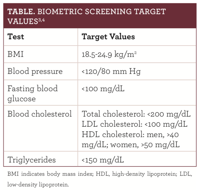 Health care professionals involved in biometric screenings should be up to date on current goals (Table). For example, updated guidelines for detecting high blood pressure lowered the range of stage 1 hypertension to a systolic blood pressure of 130 to139 mm Hg or a diastolic blood pressure of 80 to 89 mm Hg.3Patients with elevated test values should be counseled on lifestyle modifications, such as diet and exercise, and be referred to a physician for an evaluation. It is also important to keep in mind that the target values should be individualized for patients with medical conditions. Results should be discussed with employees and sent with permission to their physician issued as a referral recommendation for those without a health care provider. Employees should receive copies of all results. Pharmacists and other health care professionals can play an important role in monitoring patients as part of an interdisciplinary team.