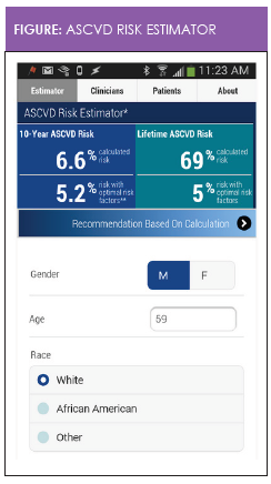The ACC/AHA’s ASCVD Risk Estimator is a free smartphone app that enables clinicians and patients to estimate 10-year and lifetime risks for ASCVD (Figure). This downloadable tool is intended for use in patients in whom ASCVD is not present and whose LDL cholesterol level is less than 190 mg/ dL.7The 10-year calculated ASCVD risk is a quantitative estimation of the absolute risk based on data from representative population samples. The 10-year risk estimate for “optimal risk factors” represents specific risk factor numbers for an individual of the same age, sex, and race. The optimal risk factors are defined as total cholesterol of 170 mg/dL, HDL cholesterol of 50 mg/ dL, untreated systolic blood pressure of 110 mm Hg, no history of diabetes, and no current tobacco use.7The risk estimate is based on group averages. For example, a 10-year ASCVD risk estimate of 10% means that among 100 patients with the same risk factor profile, 10 would be expected to have a myocardial infarction or stroke in the next 10 years.