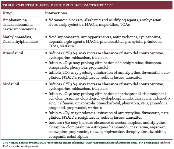 Table1,3,4,7,8,10summarizes important drug—drug interactions involving CNS stimulants. MAO inhibitors are contraindicated with amphetamines and methylphenidate. Concurrent use of these medications risks serious consequences, including hypertensive crisis and death. Prescribers should allow a significant drug washout period between these agents if they must be used simultaneously.8