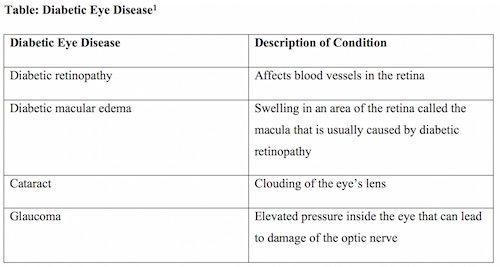Unfortunately, diabetic eye disease may cause vision loss and blindness. Diabetic eye disease is a group of conditions that includes cataracts, diabetic macular edema, diabetic retinopathy, and glaucoma.