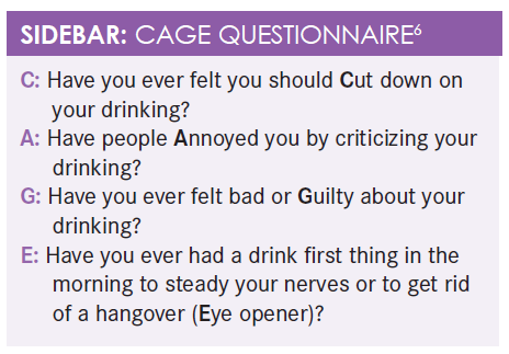 The following question is included in the driver’s medical history section: “Do you currently drink alcohol?” If the driver answers “yes,” the medical examiner must evaluate the frequency and amount of alcohol that is consumed in order to determine whether the driver poses any safety threat to the public. Several tools are available for this purpose, one of which is the CAGE Questionnaire. This questionnaire consists of 4 questions that can be asked easily during a health history (Sidebar6). Each “no” answer is scored zero, and each “yes” answer is scored 1. If a driver scores 2 or higher (which is considered clinically significant), the medical examiner must evaluate the driver further. If the driver shows signs of having an alcohol use problem, he or she should be referred to a specialist.6After the driver has completed counseling and treatment, the driver may be considered for certification.5