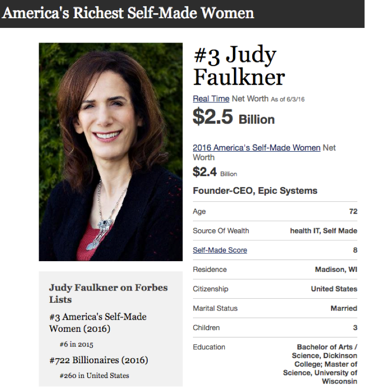 The billionaire founder and CEO of an electronic health record (EHR) system used by 1700 retail clinics nabbed the third spot onForbes’ 2016 list of America’s Richest Self-Made Women.