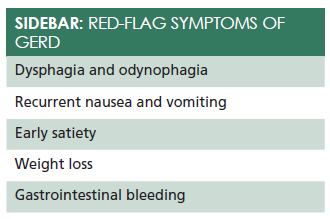 With their ability to self-medicate with OTC options, patients may not immediately disclose GERD symptoms to their clinician. Some red-flag symptoms that could indicate an alternate disease process or worsening GERD should raise concern among retail clinicians and spur referral for further evaluation by a gastroenterologist (Sidebar). Although dysphagia and odynophagia could be related to a long-standing history of GERD, patients with these symptoms should be evaluated for Barrett’s esophagus. Males older than 45 years who have a prolonged history of GERD, patients who abuse tobacco and have had weekly symptoms for longer than 1 year, obese patients with weekly symptoms over a 1-year period, those with a history of erosive gastritis, and the elderly should also be referred for further evaluation, even if no red flag symptoms are present. In addition, those who have initiated PPI therapy and have refractory symptoms should be referred to a gastroenterologist for further evaluation and diagnostic testing.