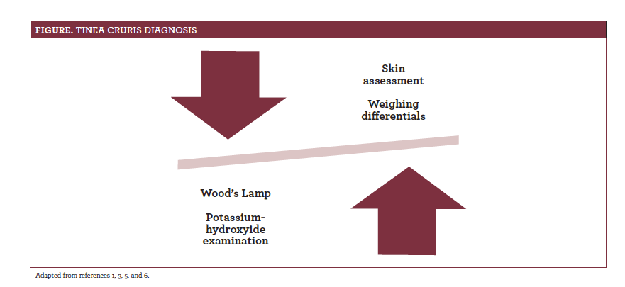 Tinea cruris needs to be distinguished from other rashes (figure1,3,5,6). Possible differential diagnoses includes candidiasis, erythrasma, intertrigo, pityriasis versicolor, and psoriasis. Candidiasis and intertrigo also cause groin rashes. Candidiasis has a characteristic “beefy red” appearance, with intense erythema, non—well-defined borders, andwhite pustules. Numerous small satellite sites are also common. Intertrigo is similar to tinea cruris, as it has a half-moon–shaped rash in the groin region, which can spread onto the thigh from moisture accumulation.4-6Pityriasis versicolor can sometimes be present in the groin area; however, asymptomatic, noninflamed lesions present in this rash can aid in distinguishing the 2 conditions.