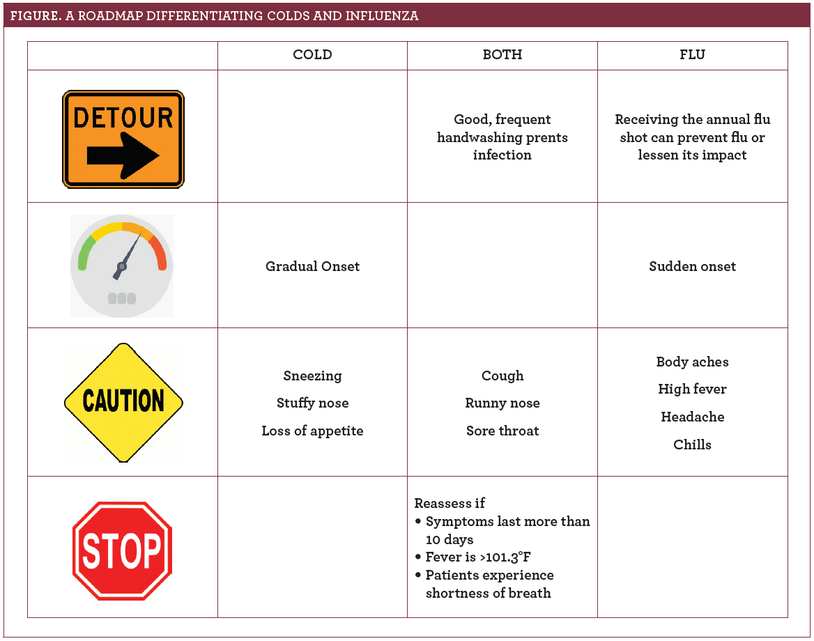 It's that time of year again. Colds, coughs, and a relentless influx of sick patients in retail health clinics keep the health care providers who work there very busy. The most important thing to keep in mind is how to differentiate between the cold and the flu. TheFigureillustrates that both illnesses share some characteristics, but overall the flu is more sudden and severe.1Peak flu season is December through March, and if symptoms indicate the flu, consider treating with antivirals. Additionally, if patients who have either a cold or the flu experience symptoms for more than 10 days, have a fever ≥101.3°F, or develop shortness of breath, they need to return to the clinic.2