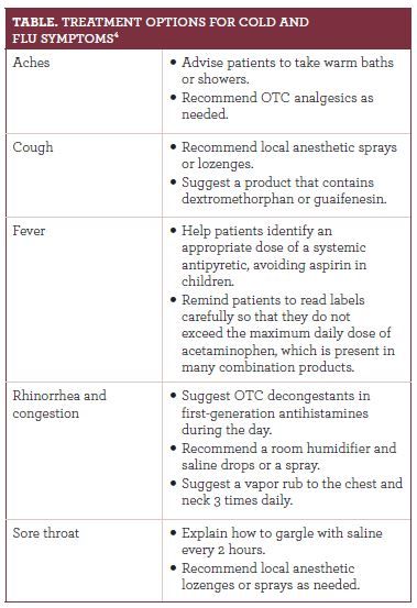 For those who do not wish to use OTC products, consider home remedies, such as chicken soup, garlic, and ginger.10Honey is one of the only natural treatments that has been proved to be more effective than a placebo in reducing the frequency and severity of a nighttime cough.11Although these products’ effectiveness is unproven, these options may be worth recommending to give patients have some sense of control over their illnesses. In addition, increasing the humidity and the temperature in a room moistens the air and helps ease congestion.5