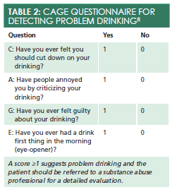 The CAGE questionnaire is a brief 4-question tool to help screen patients for problem drinking (Table 28). If patients answer “Yes” to more than one question, they should be referred to a substance abuse professional for a detailed evaluation. Primary care providers can offer the patient a referral and provide a brief intervention in the form of motivational interviewing, a patient-centered yet direct method for increasing intrinsic motivation by exploring and resolving patient ambivalence.9Primary care providers can use one simple MI tool in their practice: OARS (open-ended questions, affirming, reflective listening, and summarizing).9Remembering this acronym can help providers focus their therapeutic communication and encourage the patient to seek additional treatment.