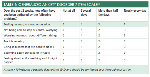 To screen for generalized anxiety disorder, primary care providers can use the GAD-7 scale, a 7-item self-report questionnaire (Table 411). A score of greater than or equal to 10 indicates a possible diagnosis of generalized anxiety disorder and should be confirmed by a thorough evaluation. Phobias are characterized by a persistent, disproportional fear of a specific object or situation such as needles or a hypoglycemic episode.2Psychological treatments for anxiety disorders are extremely effective; therefore, a referral to a mental health clinician will likely substantially improve the patient’s quality of life.2