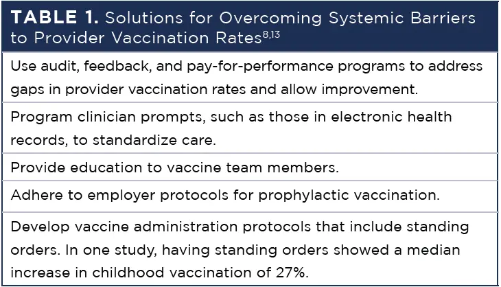 Many factors influence and contribute to vaccine hesitancy, including confidence and/or trust in the vaccine and vaccinator, convenience, and risk of disease.2 Concerns over the credibility of vaccines and disease information and the patient’s behavioral, religious, and social beliefs that encompass a broad continuum of views can also influence the decision process.7 Additional barriers include fear of vaccines, lack of believable information, systemic obstacles such as cost and drug storage, and vaccine accessibility.8 In addition, some people simply fail to prioritize vaccinations.8