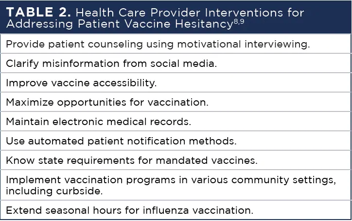 Additional strategies exist to combat vaccine hesitancy, alleviate patient concerns, and successfully move the needle from vaccine hesitancy to vaccine acceptance (Table 2).8,9