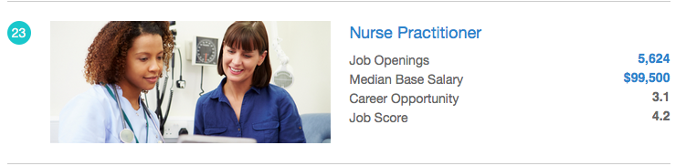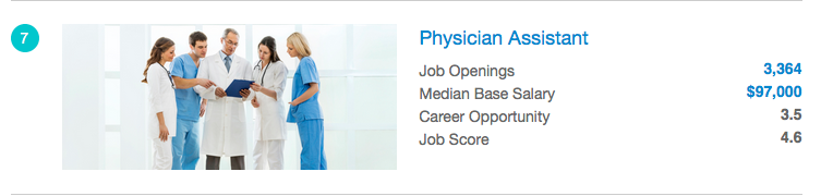 Physician assistant landed the 7thspot with an overall job score of 4.6 on a 5.0 scale, while nurse practitioner took the 23rdspot with an overall score of 4.2.