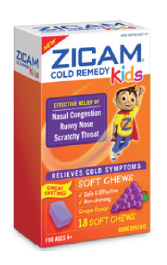 Zicam Kids Cold Relief Grape Soft Chews are formulated to relieve kids’ cold symptoms, including runny nose, nasal congestion, and scratchy throat. The easy-to-chew, quick-dissolving chews are nondrowsy and homeopathic. They contain zincum aceticum and zincum gluconicum, and are recommended for use in children aged 6 to 11 years. The chews should not be used in children younger than 6 years. Children should chew and swallow 1 soft chew every 3 hours.