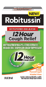 Robitussin 12 Hour Cough Relief is an extended-release dextromethorphan polistirex cough syrup. The product is available in both grape and orange flavors, and formulated to relieve minor throat and bronchial irritation associated with the common cold or inhaled irritants. Dosing instructions and amounts vary by age, but the cough syrup is not recommended for use in children younger than 4 years.