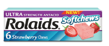 Rolaids Softchews deliver fast-acting relief of heartburn, sour stomach, and acid indigestion. The chews are available in strawberry and orange flavors. Each chew contains 1330 mg of calcium carbonate as an antacid, and 235 mg of magnesium hydroxide, also as an antacid. Patients should chew 2 to 3 chews as symptoms occur, as directed by a doctor. Patients should not take more than 5 chews in a 24-hour period, and should not take the maximum dosage for more than 2 weeks.