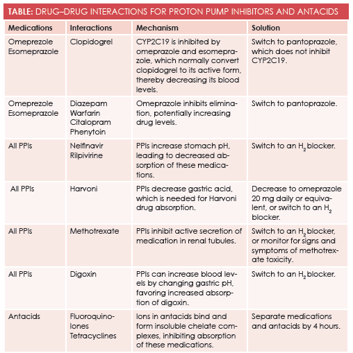 PPIs and antacids are not benign. Multiple drug interactions and adverse effects need to be considered when prescribing these medications (Table). Retail clinicians should have a careful plan to manage patients on PPIs and antacids, and patients should be monitored at every clinic visit to determine whether the medication should be continued. PPIs and antacids truly are wonderful medications when used correctly.