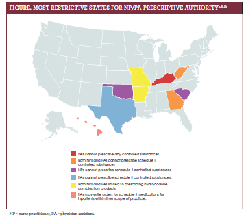 Similar to NPs, several states have additional restrictions. Three states—Georgia, West Virginia, and Texas—do not allow PAs to prescribe any Schedule II controlled substances, and 2 states, Missouri and Arkansas, limit PAs to prescribing hydrocodone combination products only. In Hawaii, PAs may only write orders for Schedule II medications for inpatients within their scope of practice (figure5,8,19).8