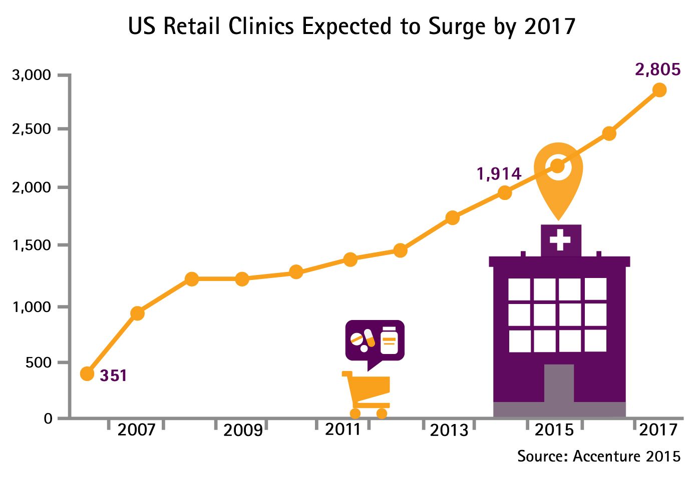 As more Americans are turning to retail clinics for their health care needs, the number of retails clinics is now projected to surpass 2800 by 2017, significantly up from about 1900 in 2014.
