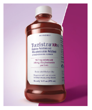 Indication:The FDA has approved Tuzistra XR—a combination of codeine, an opiate agonist antitussive, and chlorpheniramine, a histamine-1 receptor antagonist—for relief of cough and symptoms associated with upper respiratory allergies or the common cold. Tuzistra XR is not indicated for patients younger than 18 years. The recommended dose in adults 18 years and older is 10 mL every 12 hours, not to exceed 2 doses (20 mL) in 24 hours.