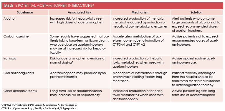 Although the efficacy of alternating ibuprofen and acetaminophen has been questioned, the drugs’ individual safety and efficacy are well proven.1To avoid side effects and unintended consequences from potential interactions, analgesics should be taken at the lowest effective dose for the shortest period of time.2For providers in convenient care settings, the main focus must be 2-fold: immediate relief of the patient’s pain and management of the underlying condition. In order to manage the pain and condition effectively, the practitioner must understand the importance of dose efficacy.Tables 1 and 23provide a reference to potential interactions for both ibuprofen and acetaminophen.
