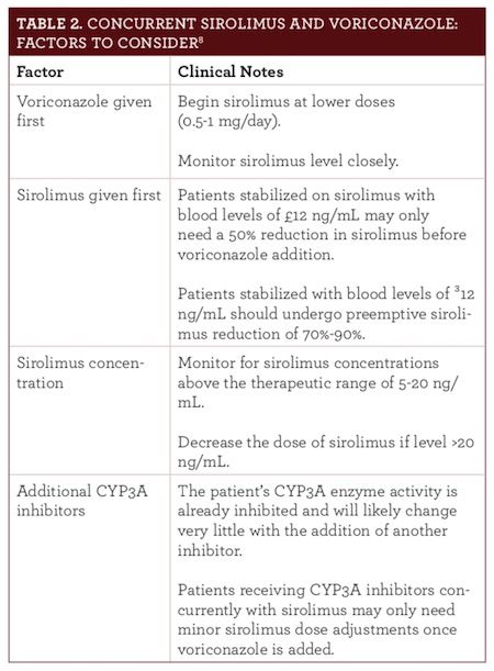 Doing so requires a sirolimus dose reduction up to 90%, careful consideration of which drug is given first, sirolimus concentration, concurrent disease states, and additional CYP3A inhibitors.