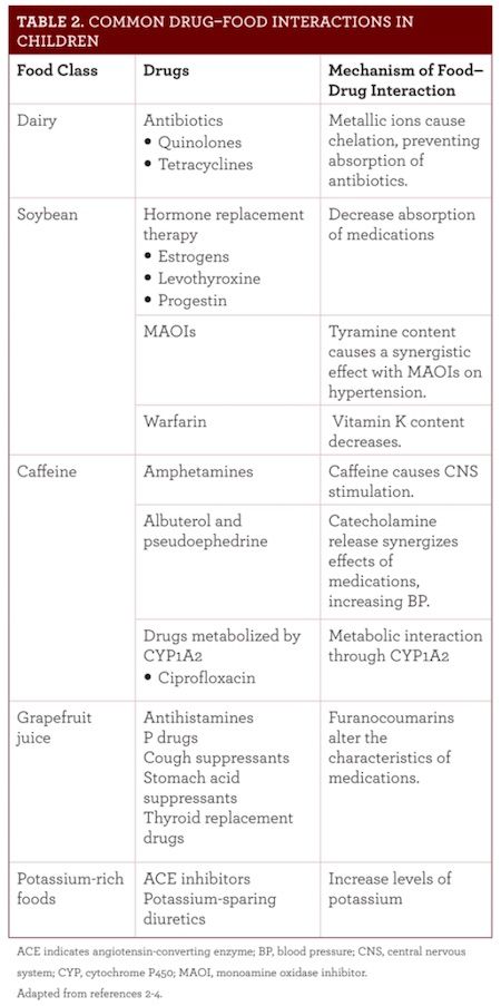 Medication use in children continues to increase because of the rise in chronic diseases and disorders such as cancer, diabetes, high BP, neurodevelopmental disorders, and obesity. The Joint Commission expects health care providers to identify potential drug—food interactions, avoid harm to patients, and note potential interactions in the medical record.2Table 2 summarizes common food—drug interactions.2-4