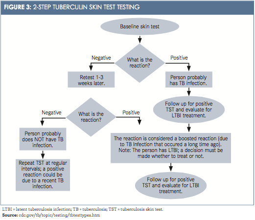 3. Testing for tuberculosis. CDC website. cdc.gov/tb/publications/factsheets/testing/tb_testing.htm. Updated September 1, 2016. Accessed October 3, 2016.