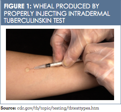 TST can be administered the same day as live virus vaccinations. If not completed on the same day, the testing should be completed 4 to 6 weeks after live virus vaccine administration.13The standardized procedure for TST includes using a 27-gauge tuberculin syringe, bevel facing upward, to inject 0.1 ml of purified protein derivative on the inner aspect of the forearm. This intradermal injection, when placed correctly, produces a wheal (a pale ele- vation of the skin) 6 to 10 mm in diameter (Figure 1).13 The test must be read between 48 and 72 hours after placement; if not read within this timeframe, the test must be repeated. The second test can be given immediately because there is no contraindication to repeat testing.13
