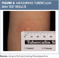 Reading the TST and interrupting the results include measuring the induration and assessing the patient’s risk of TB infection. The reaction or induration should be measured in millimeters. Induration is defined as the hardened, palpable, raised area only and should not include measuring of erythema (redness) (Figure 2).13A measurement of 5 mm or more is read as a positive TST in the following populations: